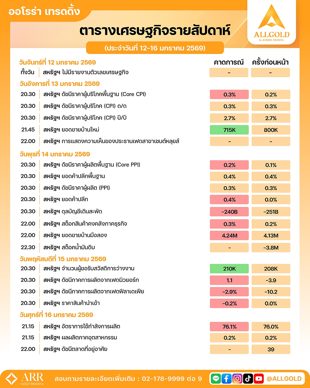 ตารางเศรษฐกิจรายสัปดาห์ ประจำวันที่ 12 มกราคม - 16 มกราคม 2569