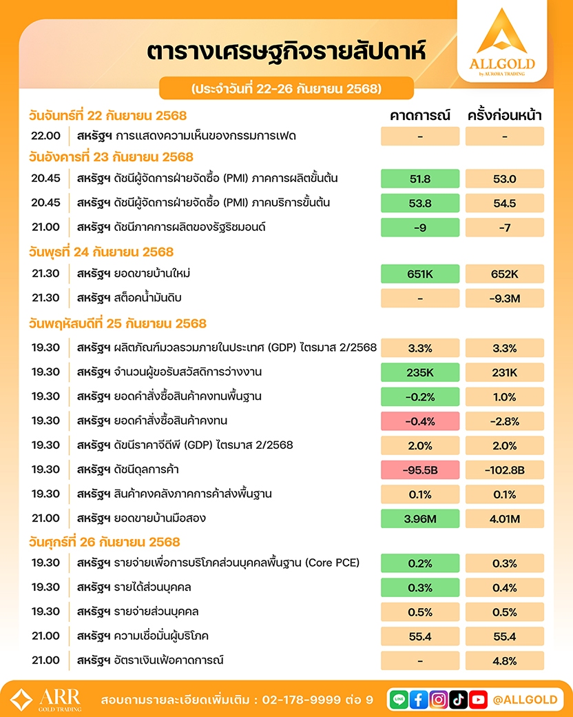 ตารางเศรษฐกิจรายสัปดาห์ ประจำวันที่ 22-26 กันยายน 2568